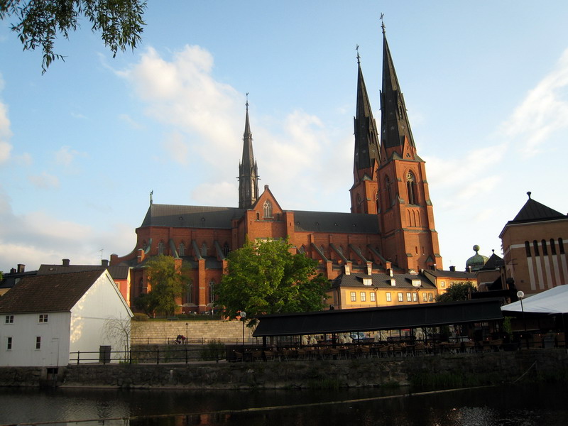 Domkyrkan from the other side of Fyrisån River. Cafe/restaurant in the foreground overlooking the river.