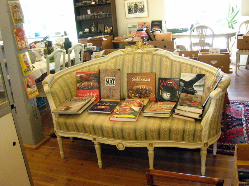 Antique shop inside Ulva Kvarn. Great display of books on a Gustaviansk style sofa.