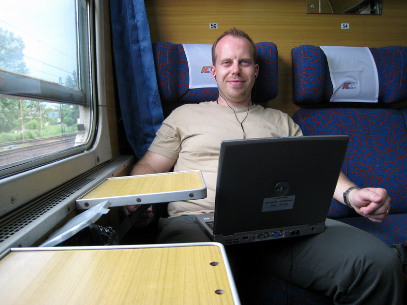 Jake on the train from Warsaw to Slupca. Jake's watching a movie on his laptop. We paid a little more for first class, good thing, there was a problem with the track and our train was over an hour late.